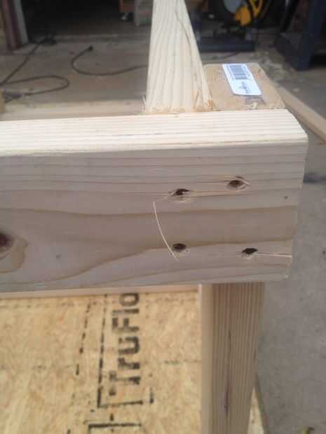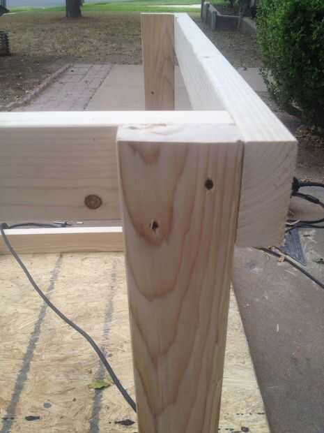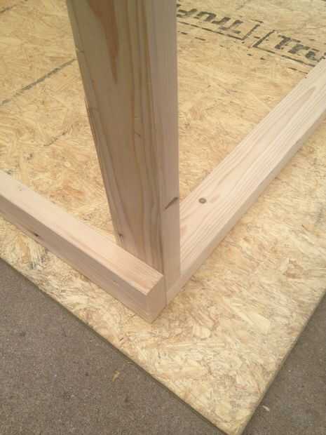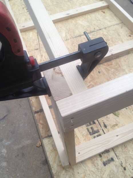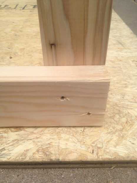 Sujete la sección piernas en esta posición perpendicular a la viga Longitudinal con una plaza de estructura para ayudar a asegurar 90 grados (ver foto). El extremo de los largueros debe hacer una esquina al ras con la sección de la pierna. Asegúrese de dejar una pequeña habitación taladro tornillo en fuera de largueros en la sección de la pierna.