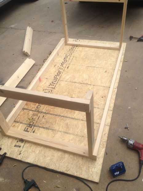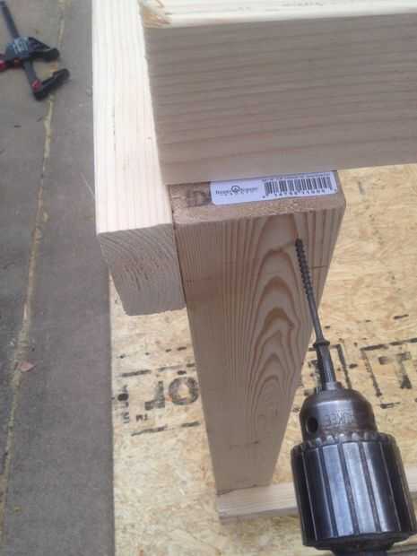 Taladro 3" tornillo de Drywall curso Longitudinal de la viga y sección de la pierna. Retire la pinza y otro tornillo del taladro colocado diagonalmente desde el primer tornillo asegurándose de que la sección piernas sigue siendo cuadrada para largueros. Un tornillo no para ambas partes de la mudanza uno contra el otro por lo que la posición no es segura hasta que se instale el segundo tornillo. Repita este paso para el otro extremo de la caja en el mismo lado como el otro lado.
