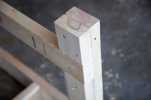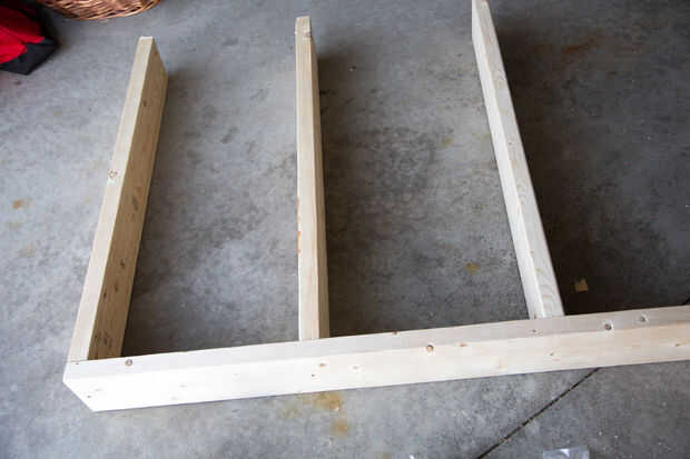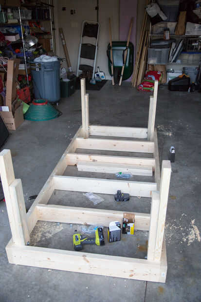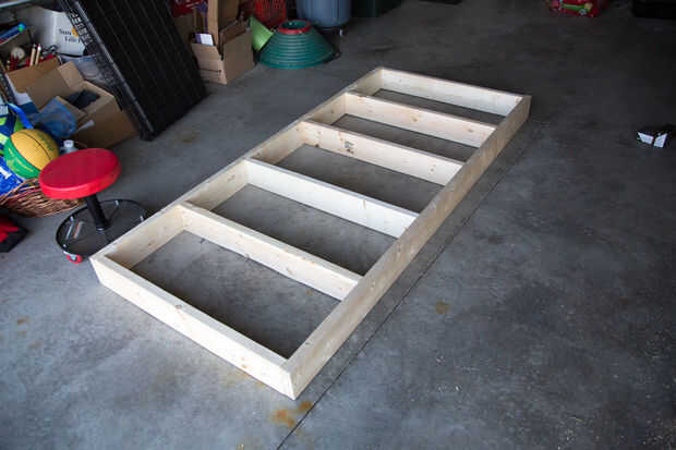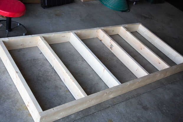 Empecé por construir el marco de la mesa de tendido en el suelo. Puesto que quería tener 4" saliente en cada borde, la longitud de la estructura es 88" x 40". Utilicé una combinación de agujeros de ocultación y driling tornillos de afuera hacia adentro a la fuerza. el cuadro. Estas son las tablas de 2 "x 6" que conforman el marco.