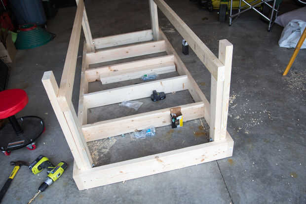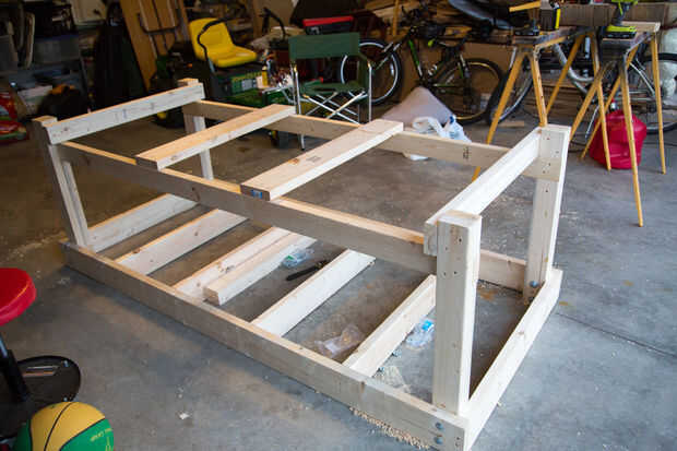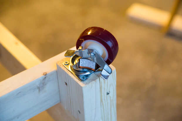 Las piernas son 2 "x 4" tablas atados con 1/2" los pernos de carruaje a la estructura. Como una sierra de vaivén, usé Junta más corta en el interior de la pierna para crear una Junta de la viga transversal, que une la cosa entera. El objetivo era hacer que el sitio de la tabla 35" de la tierra. Una vez que se instalaron las piernas y las vigas transversales montadas, usé algunos consejos extras para crear una plataforma que facilite el almacenamiento de madera por debajo. Una vez que las ruedas se instalaron, volcó la mesa.