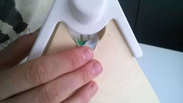 Poner la esquina de la tela a través de un agujero en la esquina de lo multiplex y cubra la pieza de la esquina, este tres veces para cada rincón.