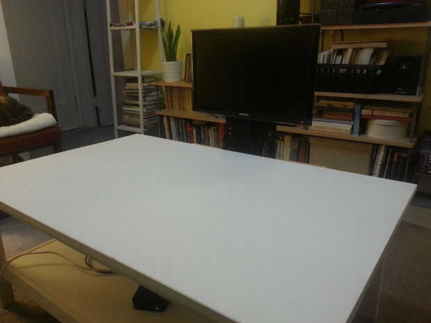 Otros han utilizado ascensores, o tenían la parte superior toda de la inclinación de la mesa con la TV por debajo. El enfoque del cajón le permite desplegar el TV sin necesidad de mover nada de la parte superior de la tabla. Los libros de mesa de centro no se mueven! También trae a la pantalla un poco más cerca que si estaba en la pared opuesta de la habitación y permite un poco de ajuste de la distancia. Por último, no es necesario mobiliario especial o hardware costoso. Ya puede tener lo que necesita en su sala de estar.