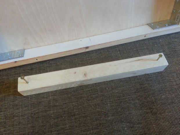 Medir a lo largo de la parte interna del frente del cajón entre los bordes de los soportes. Me mide 15". Corte 2 x 2 x 15" y use tornillos de construcción conectados al ras con la parte inferior del frente del cajón. Comprobar que sus tornillos no perforan a través del frente!