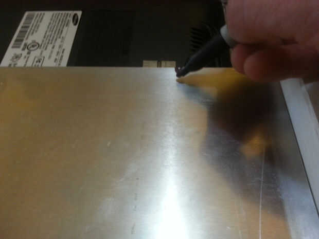 Coloque al monitor en el cajón, luego poner una regla a través de los centros de los agujeros superiores 2. Marca de la placa donde alinea con la regla. También, si la placa es más larga de lo que debe ser - o si no incluso claramente el borde de la mesa-marcar donde se debe cortar ahora.