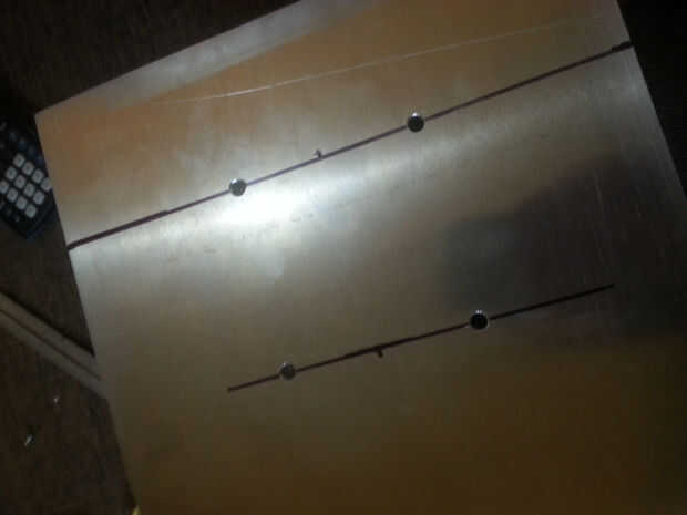 Retire la placa una vez más y pone el patrón del agujero cuadrado de 75 mm. Tengo una combo cinta métrica, con marcas de mm. Primero trace una línea a través de la placa donde se marcó. Marca el centro, luego marque 37,5 mm en la línea en cada dirección. Dibujar otra línea 75 mm hacia abajo y repita.