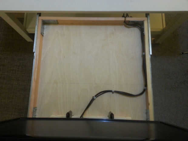 Con el TV guardado bocabajo, marca aproximadamente en la parte inferior del cajón donde el monitor soporta vienen abajo y el borde de la TV por lo que podemos enrutar los cables alrededor y nada va quedar aprisionado.
