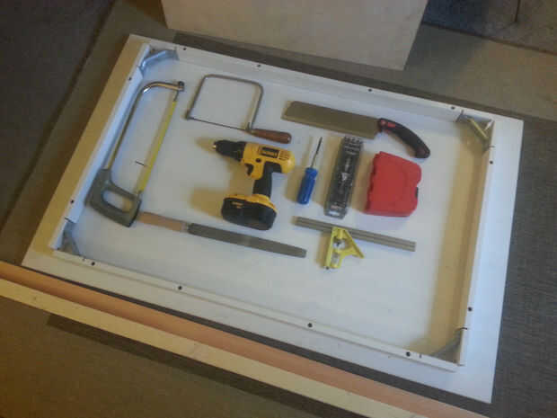 Cortar la placa de aluminio a la medida con una sierra de cinta. Pude completar el resto de este trabajo en casa con las siguientes herramientas: