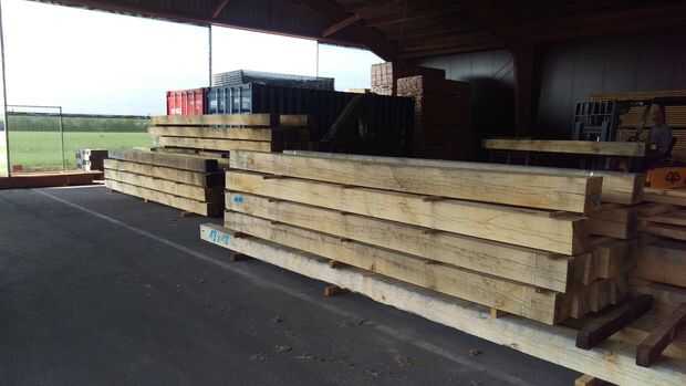En la parte posterior (segundo desde la parte superior) fue nuestra elección. Era 5 metros de largo y 200 x 200 mm. Que es un tamaño más costoso. Fue a poco de madera para nuestra mesa, así que elegimos un haz más pequeño como nuestro quinto (habrá poca diferencia en color de la esperanza). Una desventaja importante es que pega 200 * 200 que debe cortar con la sierra. Después de nueve años de secado al aire el interior era todavía relativamente húmedo en comparación con el exterior. Es importante mantener el interior en la parte superior. Como madera seca lo obtiene más 'compacto' y esta manera que incluso hacia fuera más bien.
