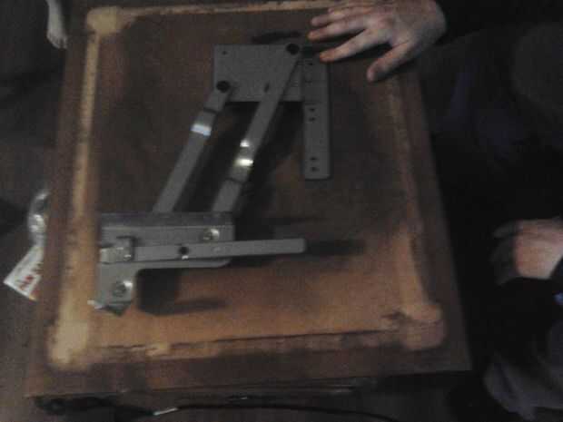 Una vez tuve el la parte superior y lateral de la ayuda apagado, me aseguré que el brazo del oscilación encajarán y funcionarán correctamente sin restricciones. La barra de soporte de madera era 1/2" y frota sobre el brazo del oscilación, por lo que tuvo que cortarse un grosor aceptable. Trazado el lugar perfecto y los agujeros de tornillo para apoyar a la parte inferior de la parte superior de la mesa. También usé una pequeña caja de cartón para obtener las dimensiones de la caja real que estaría utilizando.