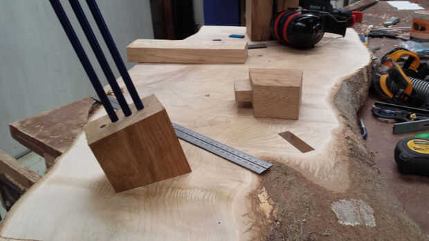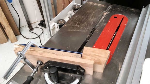 Porque quería las piernas en ángulo hacia afuera, corté los hombros usando el calibrador de inglete en la Sierra de mesa. Ajuste la altura de los controles de la hoja del grosor de la espiga, así que siempre paso algún tiempo conseguir que justo - usar una pinzas para medir la profundidad de algunos test cortes en madera.