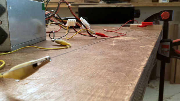 Para ajustar la temperatura varía la corriente cambiando la resistencia de la carga. Lo hice cambiando la longitud del alambre del nicrom (un viejo calentador de inmersión). Puesto simplemente, cuanto mayor sea el cable menor será la temperatura y la menos corriente se extrae de la fuente de alimentación (PSU). En mi caso la fuente de alimentación fue una vieja fuente de computadora ATX 12V. Parecía funcionar muy bien.