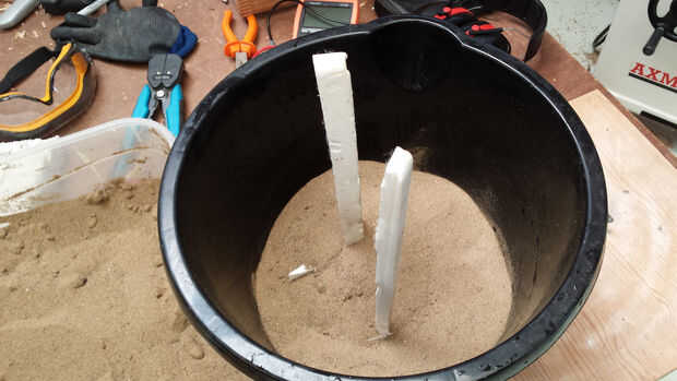 Una vez que tenía algo era más o menos feliz con, caliente del derretimiento pega algunos bebederos en, poner un poco de arena en un balde (Consejo: no use un cubo de plástico), coloque los patrones en que y llenado para arriba, alrededor entonces con arena.