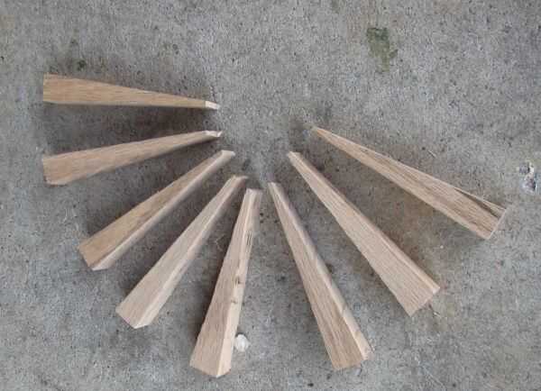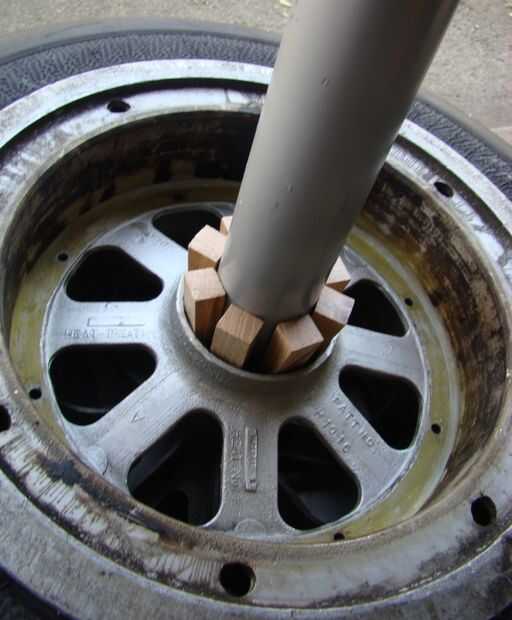 El borde fue diseñado originalmente para ser montado sobre un eje cónico. Ocho cuñas roble fueron cortadas para llenar el vacío entre el tubo de escape recto automotriz y el borde afilado. Fricción de estas cuñas es martillado es todo lo que sujeta la rueda en el tubo. De esta manera si alguna vez decido Mostrar la rueda de una manera diferente, no habrá dañado.