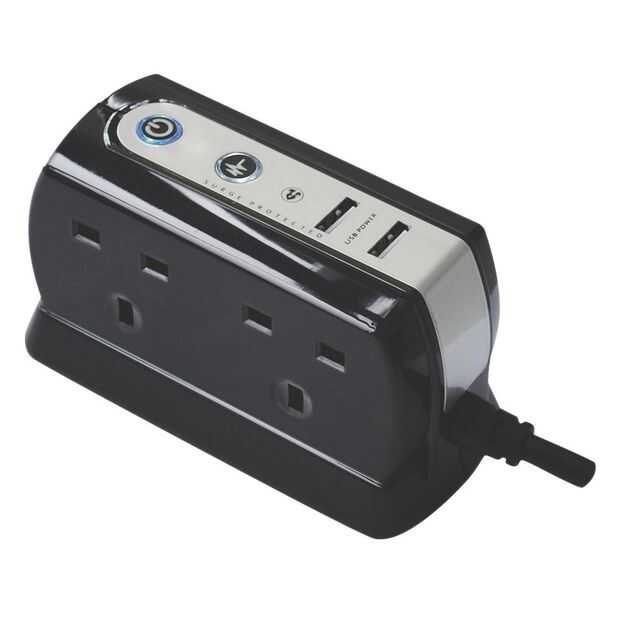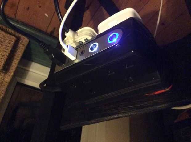 recibí mano de un cable de extensión muy útil. Tiene cuatro enchufes normales y dos USBs... Grande para cargar cosas como altavoces Bluetooth sin ocupar tu PC. Simplemente pongo un par de tornillos para madera corta en mi travesaño, dejando unos pocos milímetros que sobresale, y la unidad de potencia sólo hace clic en ellos.