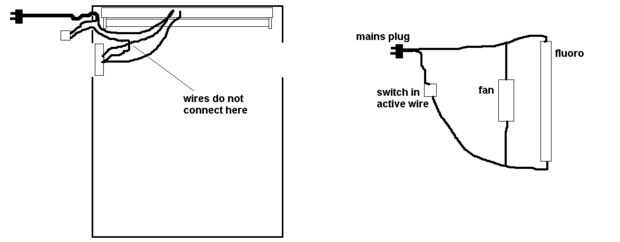 Esto pone el ventilador y el fluoro en paralelo, por lo tanto se encienden con el interruptor, y si falla uno, no detendrá la otra.