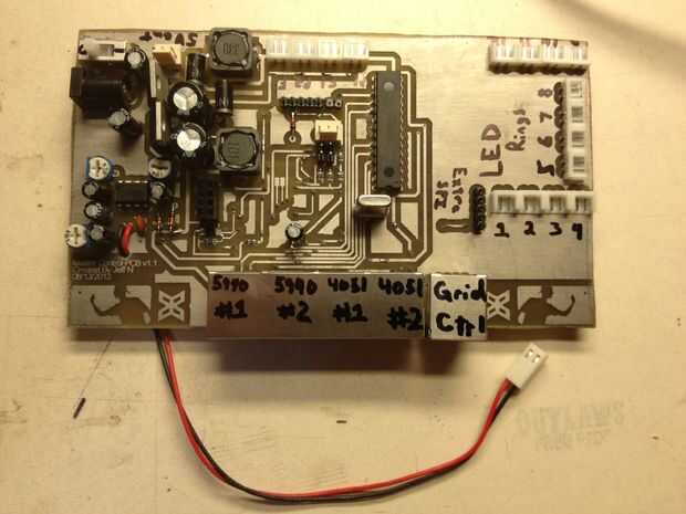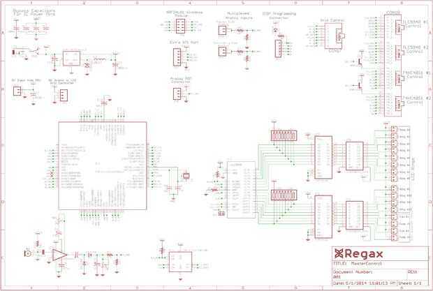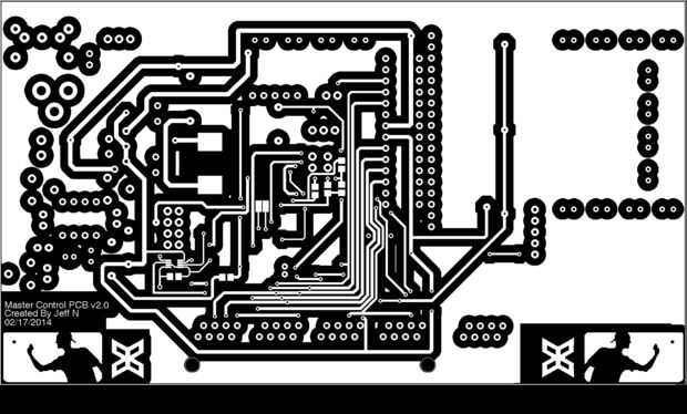 El PCB que estoy usando en mi mesa de pong de la cerveza es v1.1. La principal diferencia entre v1.1 y v2.0 es que ya no hay un regulador de 5V en el PCB. Prototipos en la tabla y había todo conectado a un tablero que estaba teniendo un poco de problemas de ruido cuando que estaba enviando datos SPI a los controladores de pod RGB. Realmente había esperado que pasaría viendo como se está ejecutando la señal a través de 15"- 25" de cobre y el alambre (que es un largo maneras para una alta velocidad señal SPI viajar) así que simplemente instalé un búfer. Esto tomó el cuidado del problema y todo funcionaba bien hasta que me cansara de prototipos. Cuando hice el PCB me encontré con los mismos errores de ruido en la línea SPI de cuando era prototipos sólo que esta vez tenía un tampón instalado. Había analizado el PCB, agregué tapas de desacoplamiento, acortados cables, etc. y no podría conseguirlo para funcionar correctamente. Finalmente me di cuenta que era la fuente de alimentación de 5V en el PCB que estaba creando el ruido, así que compró una unidad de alimentación 5V 10A, modificado mi PCB, extrae la fuente de alimentación de 5V y conectar la nueva fuente de alimentación externa 5V 10A. Esto tomó el cuidado del problema y todo comenzó trabajando exactamente como se supone que otra vez.