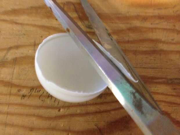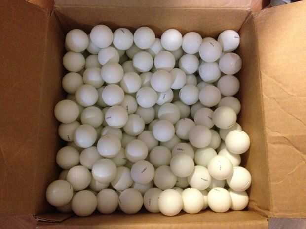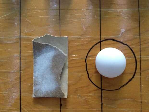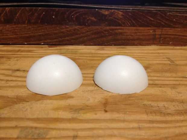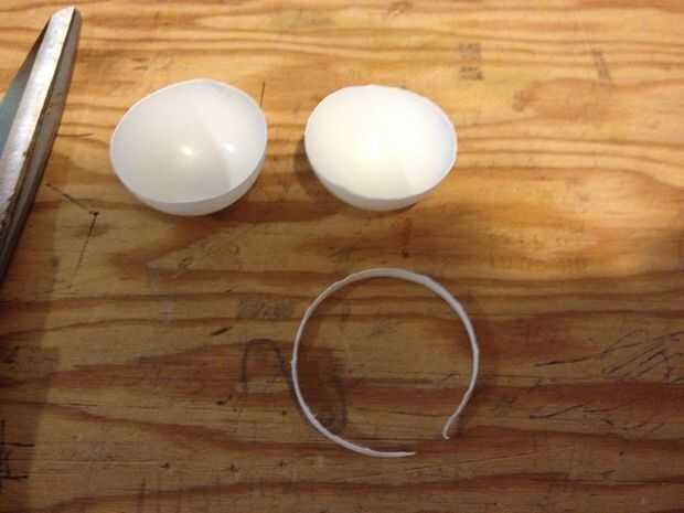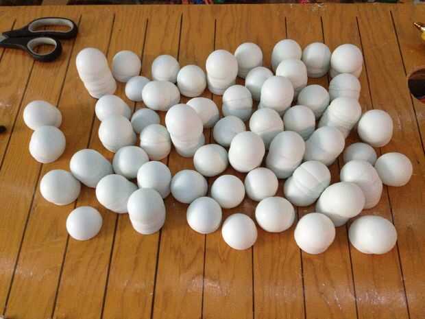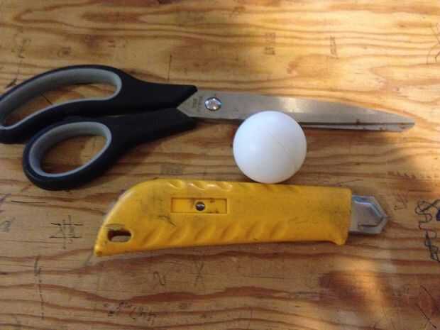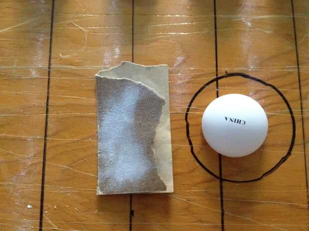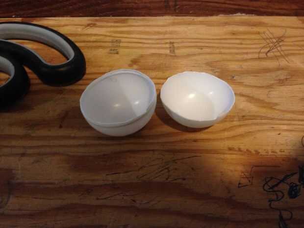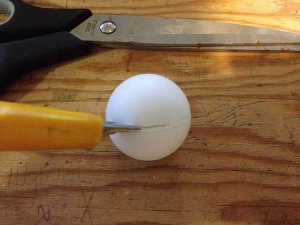 Corte en la pelota de ping-pong cuidadosamente con el cuchillo y cortar poco a poco por el medio de la bola hasta que se divide en dos mitades. No te preocupes si una mitad es más alto que el otro porque todavía tenemos que tomar nuestras tijeras y recortar la banda de centro que se utilizó para unir las dos mitades. Una vez que recorte la banda del centro de las bolas estarán más cercanos en altura unos a otros. Como cada medio está entre 5/8" y 3/4" alto, estará bien (es bastante fácil de hacer esto constantemente). Si hay un logo en cualquiera de las mitades, arena apagado con un papel de lija fino. Poner las dos mitades en una pila una vez que están completos, coge la otra bola y repetir el proceso... 191 veces.