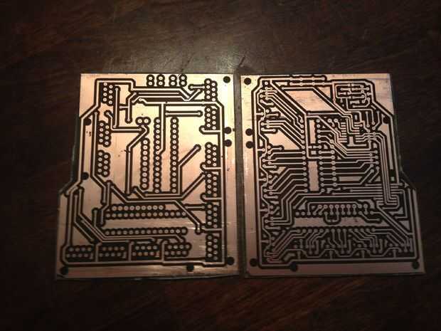 Hay un archivo PDF al final de este paso que contiene las partes superior e inferior de la PCB. Como los otros PCB, tiene que ser impreso en una escala de 1:1 y la parte superior de la Junta ya ha sido reflejada por el método de transferencia de toner. Solo imprima los archivos en papel brillante o papel de PCB, hierro laminado a la PCB, grabar las juntas y luego perfore los.