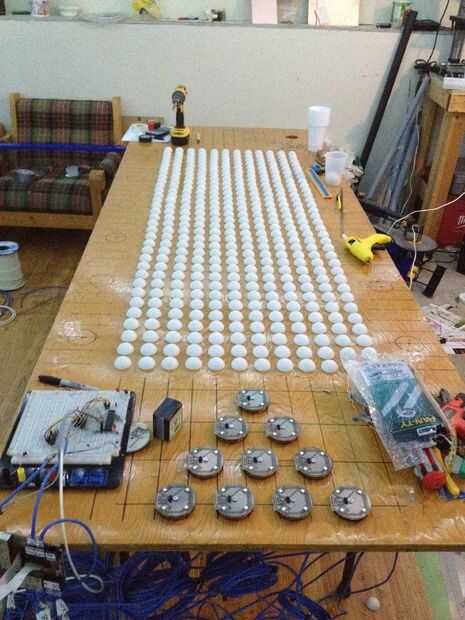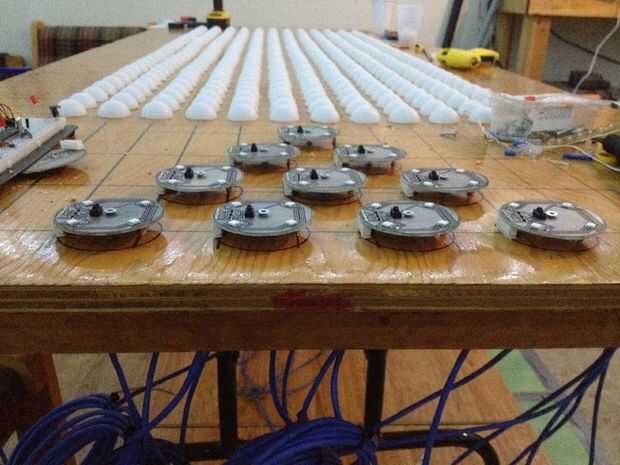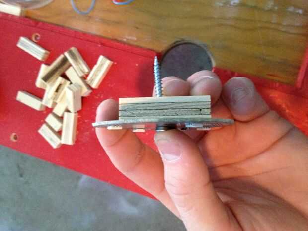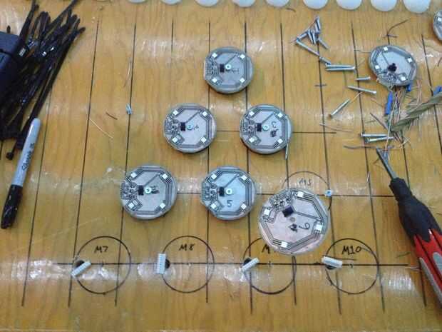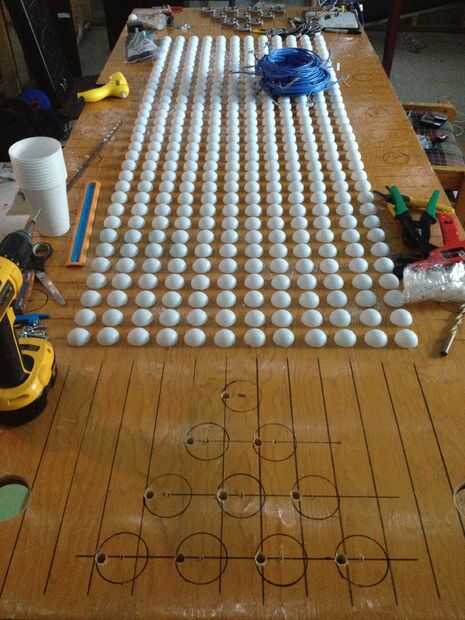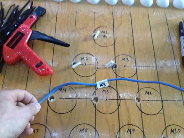 Tomar 20 todos los separadores 2"/ 1/2" x 1/2" que tenemos y perfore 3/16" (4.8 mm) agujero derecho en el centro de cada uno. Fije cada mazo de cables al conector en cada vaina RGB, un 1½" tornillo de alimentación a través de cada bolsita, agregar a un espaciador debajo, entonces coloque la cápsula en su lugar y atorníllelo firmemente a la mesa. Ahora estamos listos para enganchar para arriba!