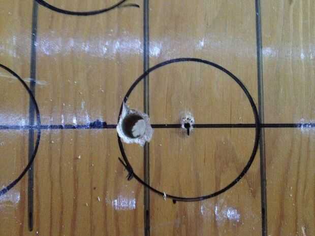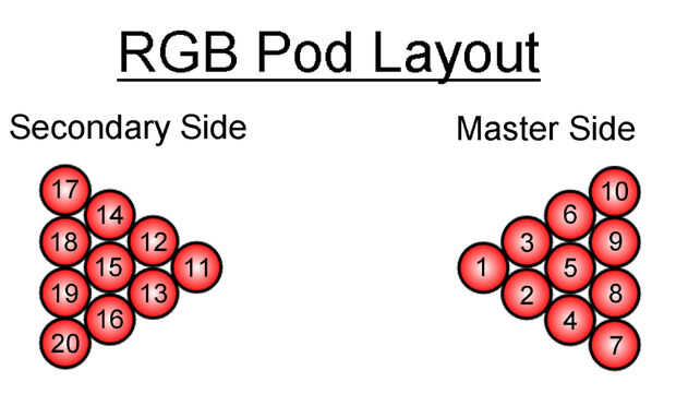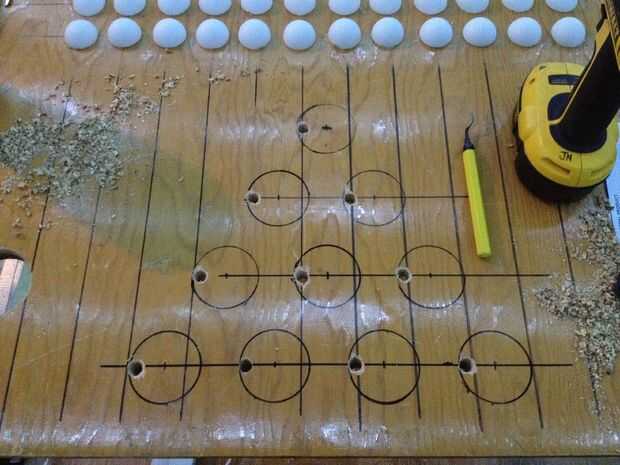 No dibujes un 1¼" radio alrededor de cada lugar de la vaina como lo hice. No sirve ningún propósito y tienes que lavarte apagado antes de instalar de todos modos las vainas. Inserte un taladro de 3/8 broca en el taladro y perforar un agujero que es 1"(25,4 mm) a la izquierda de cada marca. Esto es donde se alimentará el pod RGB CAT5 línea en la parte inferior de la tabla. Alimentar un arnés de pod RGB a través de cada orificio y conecte las clavijas de la encrespadura en un conector en la parte superior de la tabla (instrucciones de cableado paso #19).