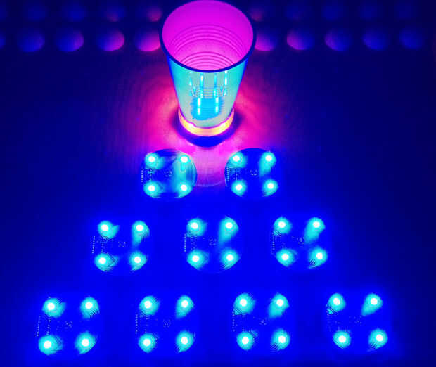 Ahora que sabemos que están trabajando las vainas RGB, vamos a probar cada sensor infrarrojo de cada consola. En la parte inferior de este paso es un archivo zip que contiene la fuente de código, descargarlo, abrirlo, compilarlo y programar en el PIC en la placa principal. Como no hemos instalado la hoja de lexan sobre la parte superior de las vainas RGB todavía, tuve que usar un panel de vidrio pequeño situado en la parte superior la las vainas RGB. Esto me permitió colocar las tazas de cerveza encima de cada vaina y probarlo. Al iniciar la tabla de pong de la cerveza no puede existir nada encima de cualquiera de los sensores IR. Tarda unas milisegundos para calibrar el derecho de sensores IR cuando empieza para arriba, después de eso, tazas pueden colocarse sobre la parte superior de las vainas. Una vez más, llegaremos a la parte de software de las cosas en la otra mitad de este Instructable.