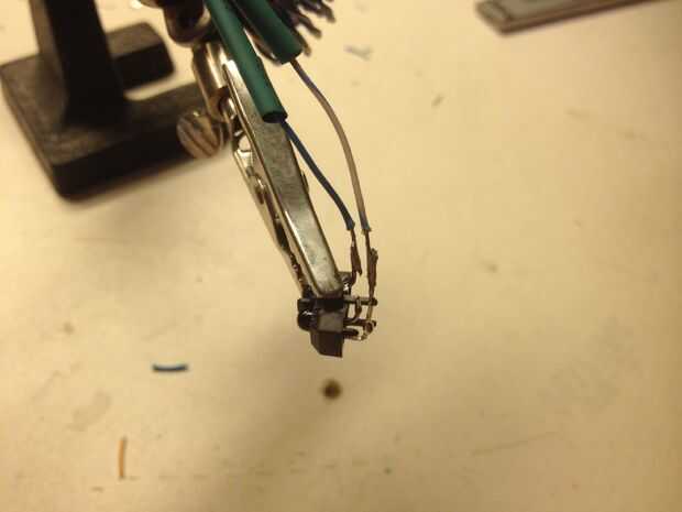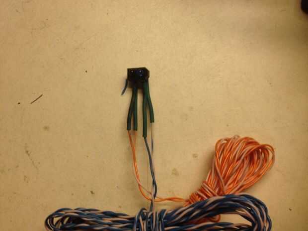 Recorte los cables de los sensores TCRT5000 y doblarlas hacia arriba en ángulo recto, asegurándose de que no cruzan caminos. Tomar un par de alambre, agregar una sección de termoencogibles a cada hebra y luego soldar un cable al ánodo y un cable para el cátodo del emisor de IR. Tomar el otro par de cables y repita el mismo proceso para el receptor de infrarrojos. Deslice el termo retráctil hacia abajo y utilizar un encendedor para reducir alrededor de los conductores. Hacer lo mismo para los otros sensores de la lavadora 3 bola mientras se asegura de que los cables están conectados a qué conduce el sensor TCRT5000.