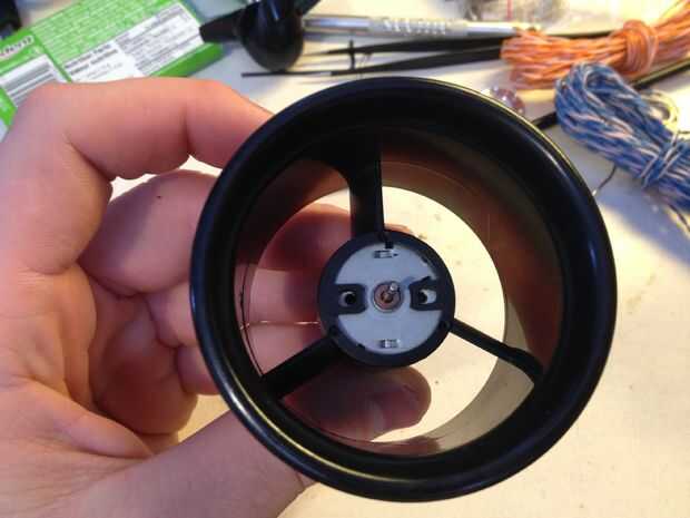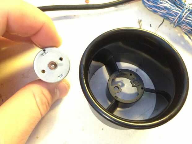 Lo primero que tenemos que hacer es montar el ventilador. Instale el motor eléctrico de 24mm dentro de la carcasa del ventilador. Utilice los dos superficiales tornillos (tuve que cortar hacia abajo un poco más con una sierra para metales) que vienen con el ventilador para fijar el motor en su lugar. Una vez que se asegura el motor, tomar las aspas del ventilador, deslícelo sobre el eje del motor y utilice la llave hexagonal para apretar la cuchilla en el eje del motor. La hoja ahora debe giren libremente entre la carcasa cuando se gire con la mano.