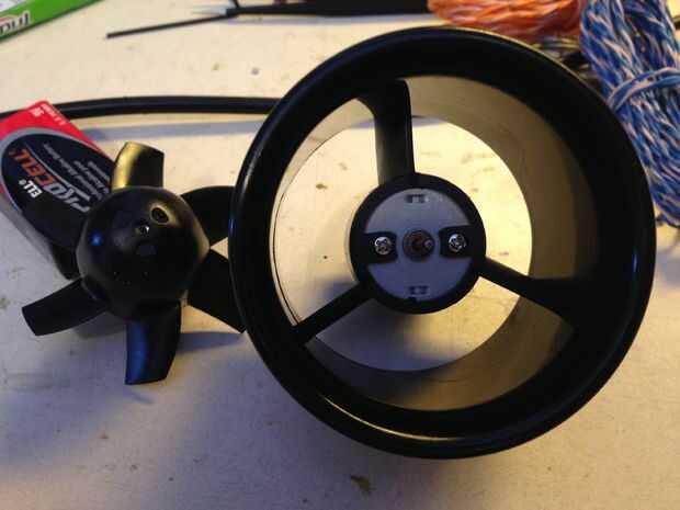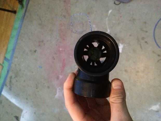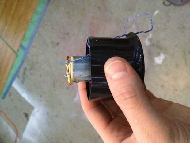 Una vez que el motor tiene el alambre y condensadores soldados a él, poner un pedazo de ancho de cinta o plástico encima de las conexiones para evitar que el agua de la lavadora de la bola en el motor. Luego realizar una pequeña muesca en el back-end de la carcasa del ventilador para que podemos enrutar los cables del motor a través de él. Coloque el acoplador de T contra el back-end de la carcasa del ventilador y utilizar cinta aislante para unir las dos partes. Ahora tenemos un abanico completo y están mucho más cercanos de conseguir las arandelas de la bola terminadas!