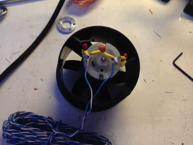 Voltee el ventilador, soldadura tres 0.1µF condensadores del motor para ayudar a suprimir el ruido eléctrico que el motor va a crear. Un condensador se vaya de la terminal positiva del motor a la cubierta exterior del motor, el condensador próximo será soldado entre el positivo terminal y negativo terminal del motor y el último condensador se suelda de la terminal negativa del motor a la cubierta del motor. Este es un paso muy fundamental ya que puede ocasionar las cápsulas RGB a parpadear (ruido en el bus SPI) si no suprimen el ruido que crean las arandelas de dos bolas. A continuación, la soldadura de la línea de CAT5 blanco y azul a la terminal positiva y la línea azul a la terminal negativa del motor.