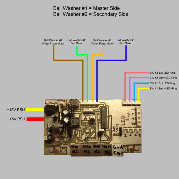 Ahora solo tenemos que conectar la bola lavadora bombas y ventiladores. Se refieren a la PCB principal esquemático para la clarificación. CON13 conecta hasta el ventilador del soplador para la arandela de la bola de lado principal (BW #1), CON14 conecta hasta la bomba de agua para BW #1, CON15 conecta hasta el ventilador del soplador para BW #2 y la bomba de agua para BW #2 conecta hasta CON16. He creado un esquema para la referencia.