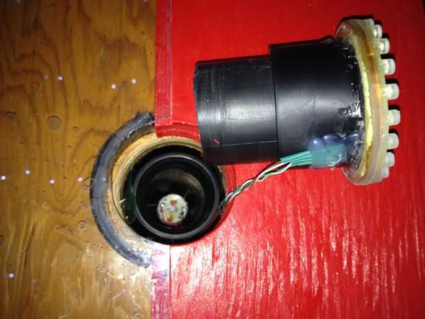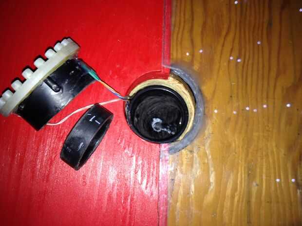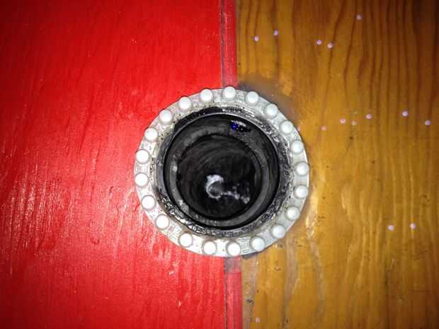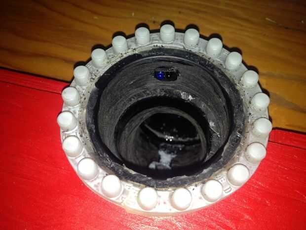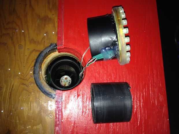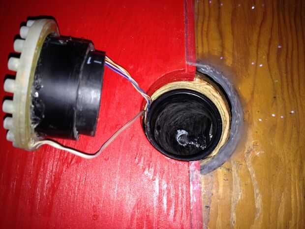 A continuación, vaya al punto de salida de la lavadora de la bola (a la derecha del reproductor) y fijar la longitud de 40mm de tubería de 1.5" ABS para el acoplador de anillo LED. Pase los cables desde el acoplador de anillo LED a través de la arandela de bola agujero de salida y unirse al acoplador de anillo de LED para el acoplador de T que contiene el ventilador del soplador. Presione el acoplador de anillo LED firmemente contra la mesa y ahora hemos completado el punto de salida de la lavadora de la bola en el lado principal de la tabla.