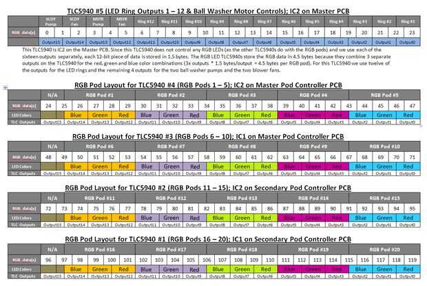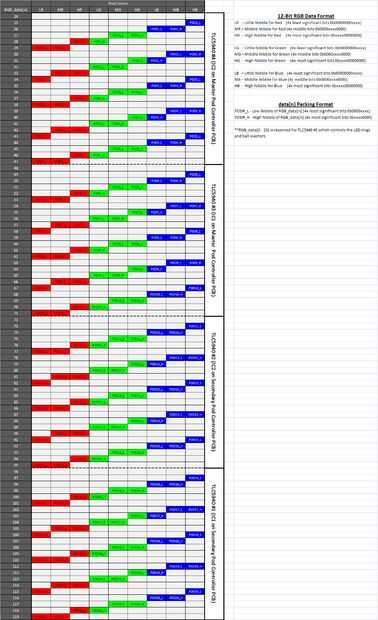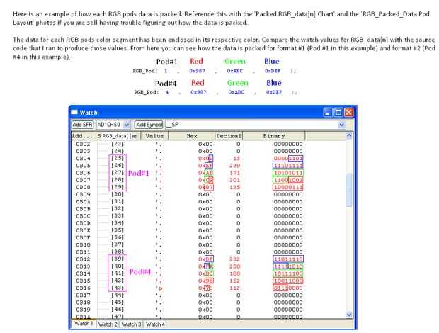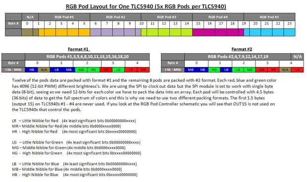Los datos de llenos de las vainas del RGB pueden ser un poco confusos a seguir ya que cada canal es de 12-bits de ancho y estamos embalaje cada valor de canales PWM en segmentos de 8 bits. Existen dos formatos diferentes para los datos del embalaje porque los datos consiguen compensar cuando estamos embalaje todos los datos en la matriz. Si se compara la estructura de datos pod RGB #5 a la de pod RGB #2, verá que pod RGB #5 comienza en medio de un byte, mientras que pod RGB #2 comienza con un byte completo.