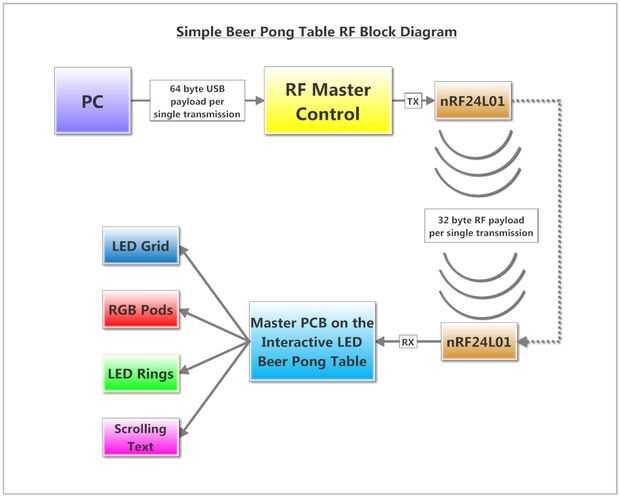 Una vez que la Junta de RF Master recibe los datos desde el PC, analizará los datos para saber que característica de la mesa de pong de la cerveza que la PC actualizada. A partir de ahí, la Junta de RF Master se separan los datos en paquetes de 32 bytes y transmitir los datos de forma inalámbrica al nRF24L01 + módulo en la tabla de pong de la cerveza.