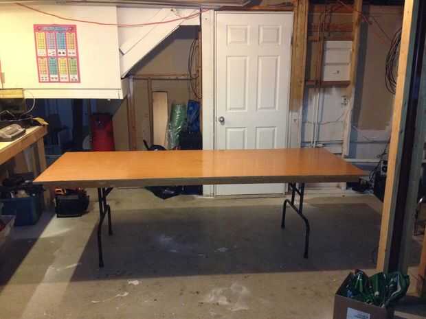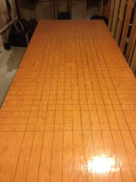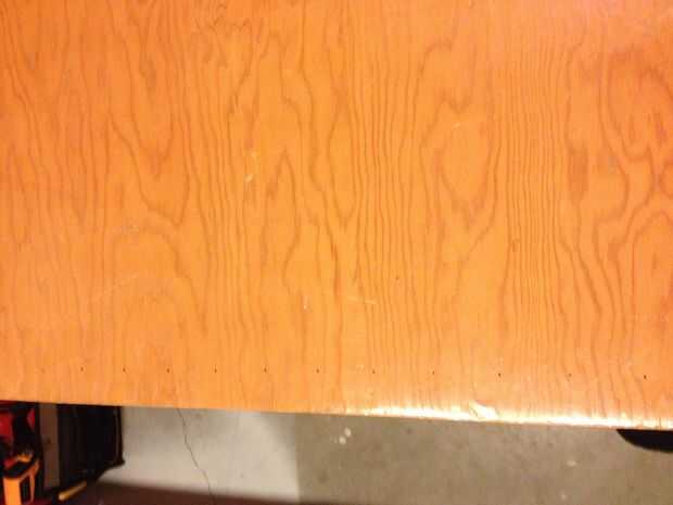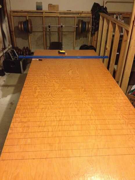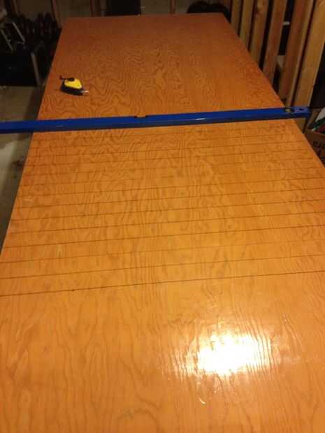 Ahora coge el dibujo que imprime desde el paso #3 de AutoCAD. En primer lugar, comenzaremos marcando 32 filas que se extienden a lo ancho de la tabla. Elegir un extremo de su mesa para el maestro y el otro a la secundaria. La mesa de pong de la cerveza es simétrica por lo que lo que hacemos a una mitad de la tabla haremos exactamente igual a la otra mitad, pero todavía es importante etiquetar cada extremo de la mesa para que tengamos una referencia para cuando empezamos a agregar la electrónica.