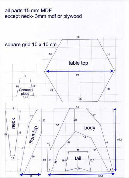 Dibujar todas las piezas en el tablero MDF de 15 mm excepto el cuello. El pedazo del cuello debe ser de 3 mm de espesor. (MDF o madera contrachapada)