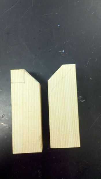 2. hacer ocho 2 "X 2" X 4" bloques. Hicimos esto mediante la reducción de cuatro 4" piezas de madera de 2" X 4", luego cortar cada pieza por la mitad longitudinalmente. Para dos de estos bloques, corte una sección en un ángulo de 45 grados, dejando aproximadamente 1" de espacio plano en la parte superior. Estas piezas se utilizará para conectar las secciones en el montaje el paso de las capas.