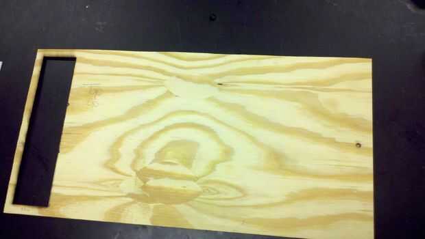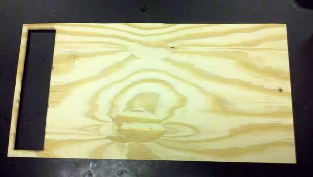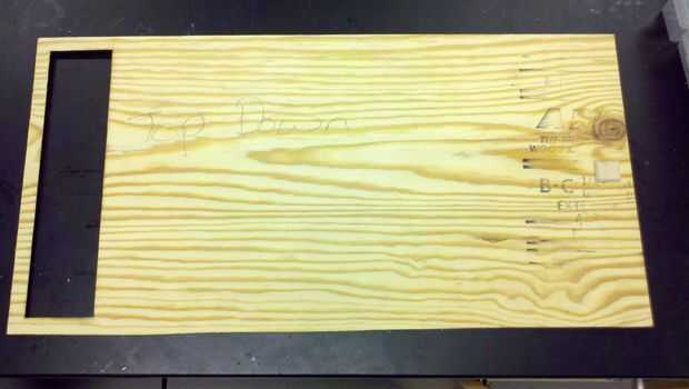 II. láser corta un agujero lo suficientemente grande como para adaptarse a su mano a través de centrado en la parte frontal (aproximadamente 2.5" de alto y 4" de ancho). El fondo del hoyo debe ser de 1.5" de la parte inferior de la pieza.