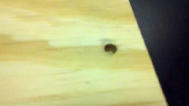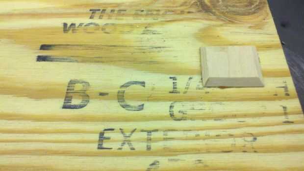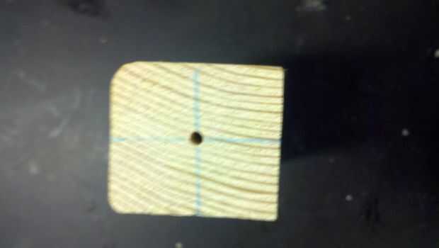 c. Haga un agujero para el pasador de soporte de rampa centrado aproximadamente 1" de la vanguardia. Pegar un cuadrado de madera en la parte inferior de la pieza de madera contrachapada para cubrir el agujero.