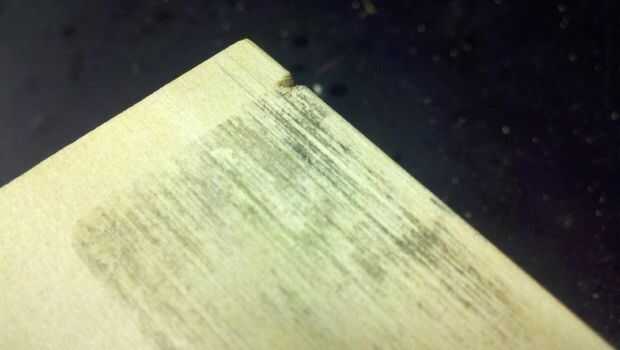 d. láser corte dos pedazos de tilo para servir como la rampa de caída de la bola, que alimenta la bola en el hueco de la capa de madera contrachapada de media. Deben tener dimensiones de 2.5" x5.3".