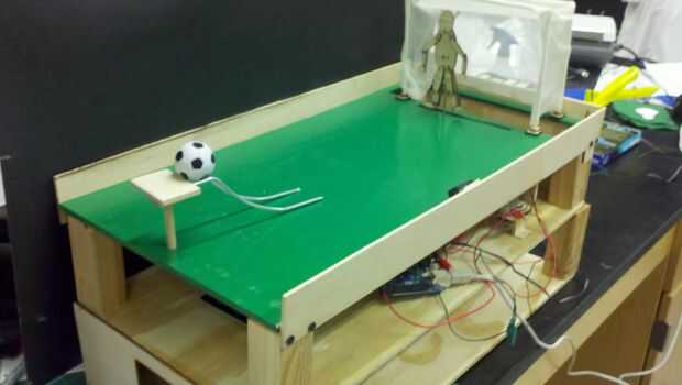 b. Coloque dos piezas cortas de madera principio donde la bola volver extremos de la rampa. Las piezas de madera deben orientarse hacia el exterior para dirigir el balón a la frontal donde el jugador recupera la pelota.
