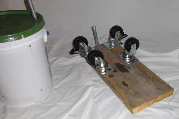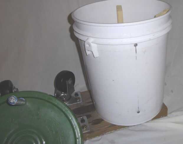 En el borde superior de la mano perforado un agujero más pequeño y luego el tornillo para atornillar. Coloque una arandela, luego un pedazo corto de conducto, una arandela y el tornillo en el agujero. Dentro de la cubeta Coloque una arandela y luego la tuerca. Coloqué el extremo del perno al ras de la tuerca no a tener una ventaja de la captura de perno en la ropa