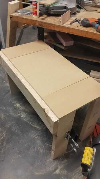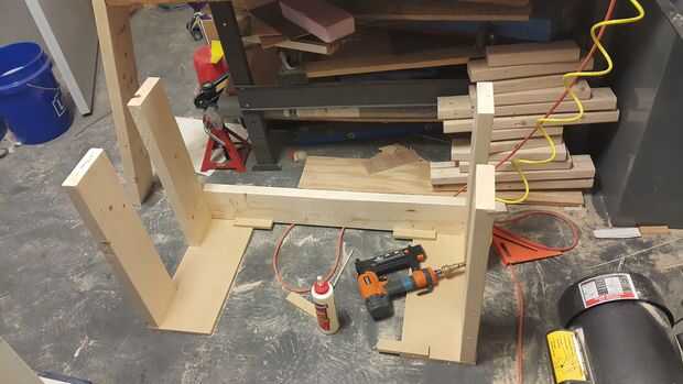 3) después de tener las piezas necesarias, encolar y clavar las 2 piernas a uno de los 25 cm de corte de tableros y otros 2 al otro corte 25 cm. (Nota para el Brad Nailer, he usado uñas largas aquí)