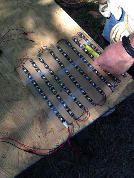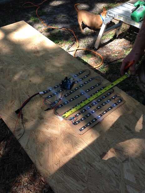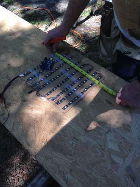 La longitud de la tira fueron unos 14" porque decidimos cortar por el lado de un pedazo de madera de la tabla, el espesor de cada tira es 1/4" de espesor. El LED debe verse a través de cada agujero en la red, y que cada apertura es una pulgada frente a la unos a otros. Por parte de su red que ha tocado el LED, corta pequeños trozos de espuma para bloquear la luz entre cada LED y pegar en tu red.