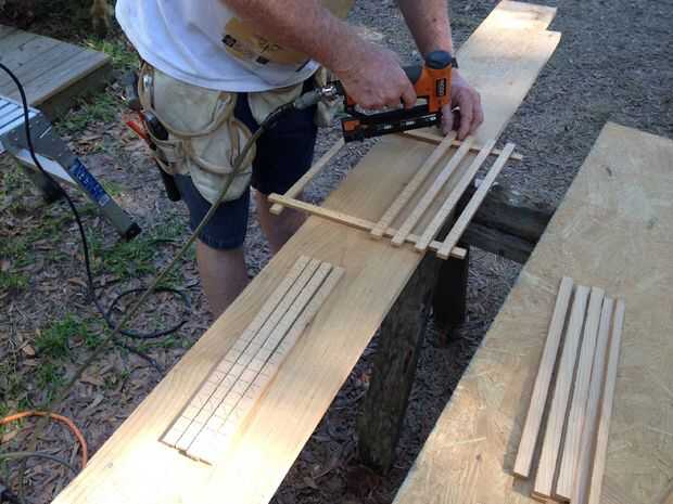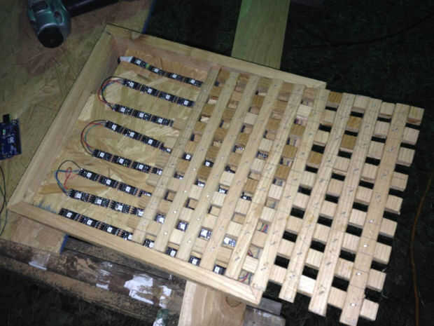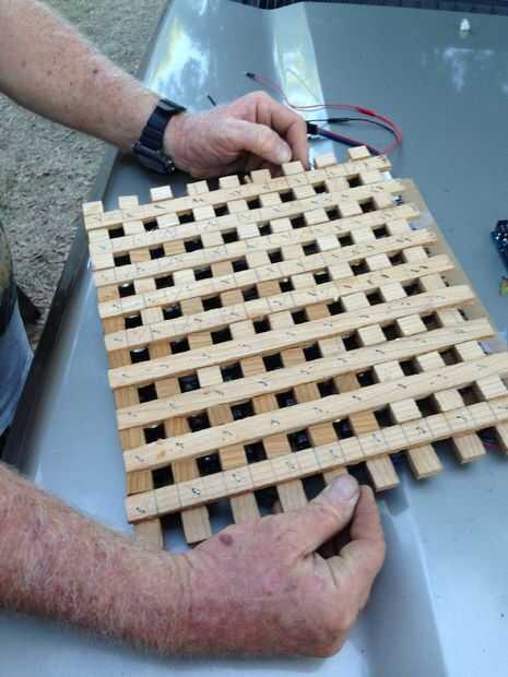 Para crear la red, vas a tener que crear según la longitud entre cada LED. Los LED son una pulgada aparte en esta red, pues crear su red según que el tamaño y asegúrese de cortar la red así que es se sienta al ras con las paredes de la caja. Decidimos utilizar una pistola de clavos grapas pequeño atado a la rejilla juntos.