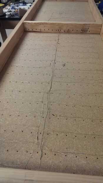 Nuestra mesa era 96 "x 24" con LEDs espaciados 1.5" a lo ancho y cada 3" a lo largo de su longitud. Utilizamos 2, 30 "x 48" pedazos de tablero de partícula con 4" y 2" a cada lado de los LEDs. El tablero de partícula fue pegado sobre un marco de 2 x 4 x dos 96 piezas largas y tres 3 x 4 x 30 piezas cruzadas de madera. El tablero de partícula era aerosol pintado negro y perforados para hacer espacio para los LEDS. Los alambres horizontales de fuertes super estaban pegados a la parte inferior de la tabla que cada soldado a los cátodos de una fila 8 LED ' s. Estas filas estaban conectadas en grupos de 8, para hacer una tierra común para 64 LED. Un alambre largo de este alambre fuerte entonces conectado a un transistor de darlington en nuestro circuito.