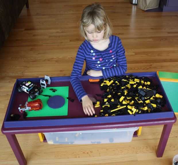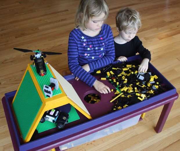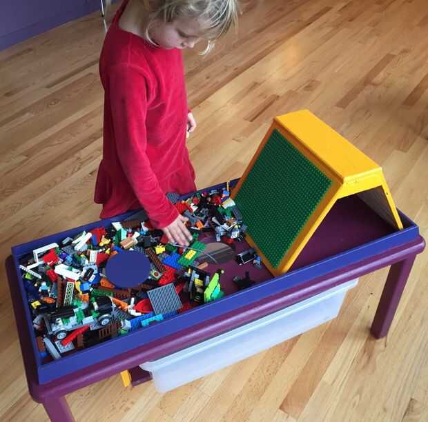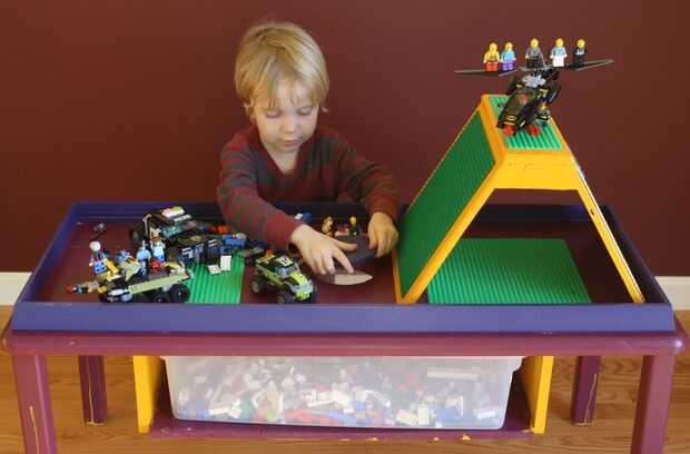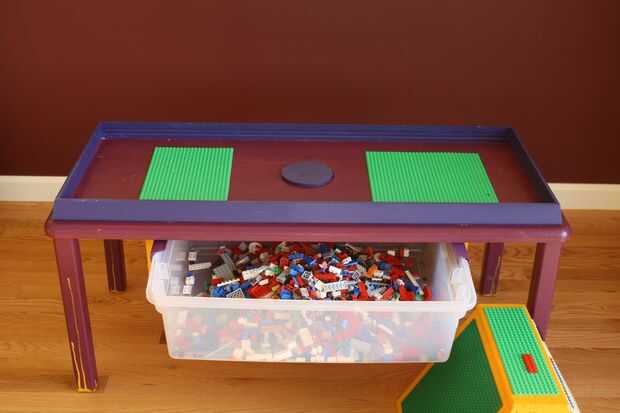 Creación de LEGO a base de muebles parece ser un derecho de paso para todos los padres. Aquí es mío. Paredes laterales de gran tamaño contienen el LEGO en la mesa durante la descarga. Una montaña personalizada con placas base LEGO anima a construir escenas y carreras de vehículos por la pendiente. Finalmente, cuando es el momento de limpiar, levante la tapa y barrer todos lo LEGO en el contenedor integrado.
