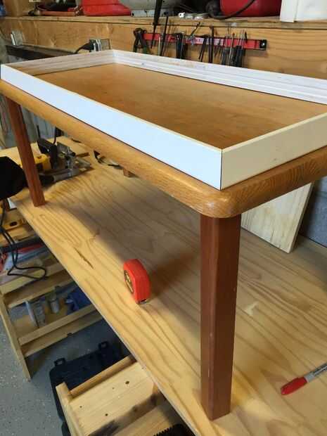 La mesa era $20 en una tienda de muebles usados. Las paredes laterales son carril silla sobrante de un proyecto de renovación del hogar. El carril de la silla es cortar con un ángulo de 45 grados y unido con pegamento y tornillos desde abajo.