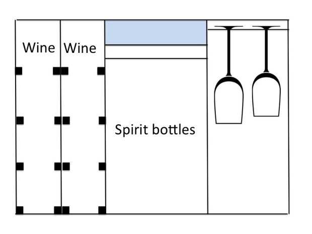 Con esta lista de requisitos el plan comenzó a reunirse y conjunto de dimensiones, el ancho por ejemplo fue a 607mm (internamente), ya que es el ancho de una hoja"media" la profundidad se determinó por la altura de una botella de vino que debe ser capaz de mentir horizontalmente dentro de la barra. mi necesidad de una gran variedad de gafas me llevan a colgar algunos y los otros tienen para maximizar el espacio. también decidí añadir un estante y un empate para el Tajo y diversos utensilios.