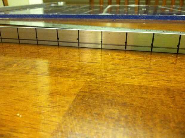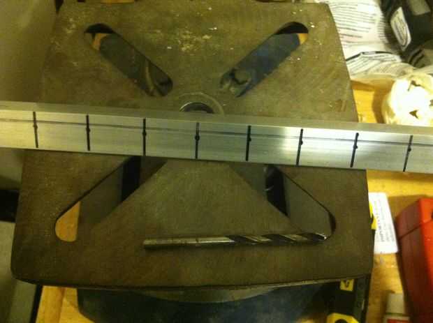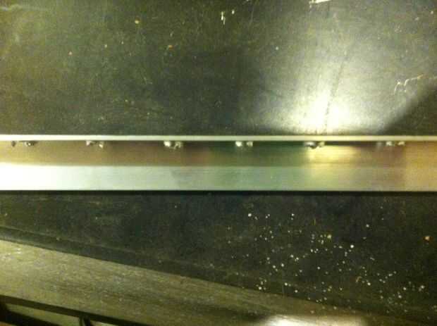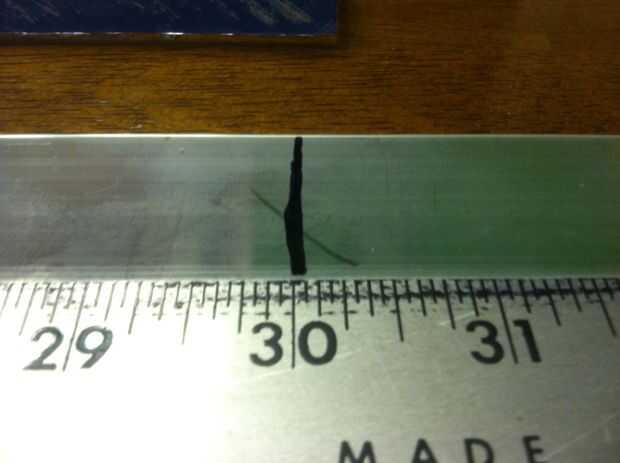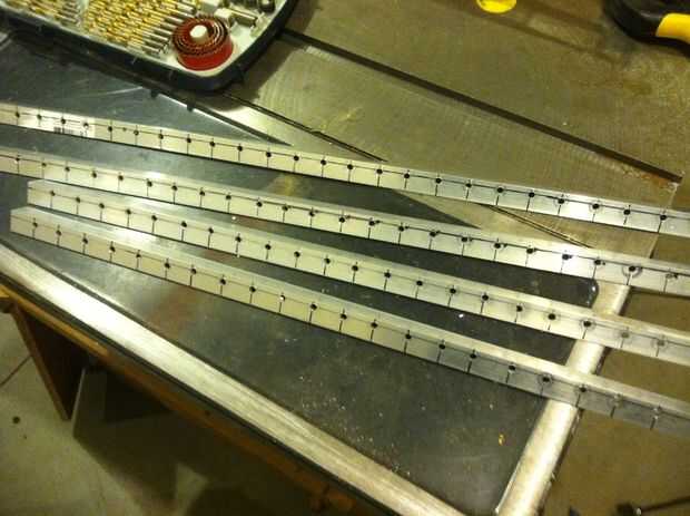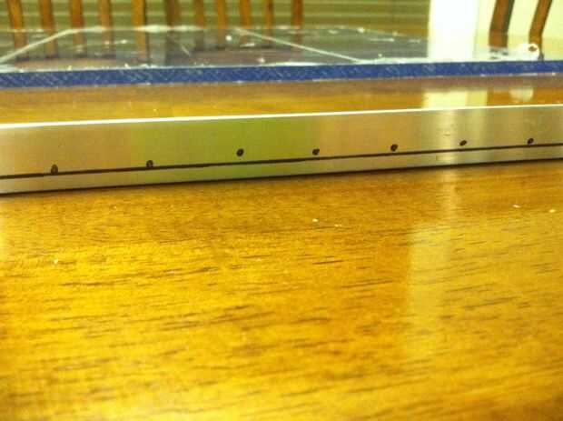 Mida el aluminio a la longitud de la Plexi y agregue 1/8 en a él. Mina fue en 30 por 24 pulgadas cortar el aluminio usando una sierra para metales. Ahora con su medida de aluminio y marca cada pulgada a lo largo de cada pieza de aluminio. Encontrar el centro de su Plexi y agregue un 1/8 en que el espesor del aluminio. Trace una línea alta que a lo largo de aluminio. Donde se unen las dos líneas es donde taladrará. Usé un 3/16 en broca de un taladro para hacer los agujeros para los LEDs. Después de perforar los orificios probablemente tengan rebabas grandes en la parte inferior. Utilice un archivo o una Dremel con una broca de molino para moler las fresas fuera.