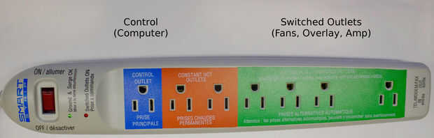 La tira de inteligente tiene un pequeño control sobre lo que puede ser necesario ajustar de vez en cuando dependiendo de la tensión de entrada. La faja inteligente salidas están controladas por un relé en la tira. Cuando se enciende el dispositivo de control (computadora), activa el relé, que se convierte en las tomas conmutadas (ventilador fuente de alimentación, amplificador de audio y toque del recubrimiento) De vez en cuando, si hay un cambio leve de la tensión, el relé puede no apagar o volver a.
